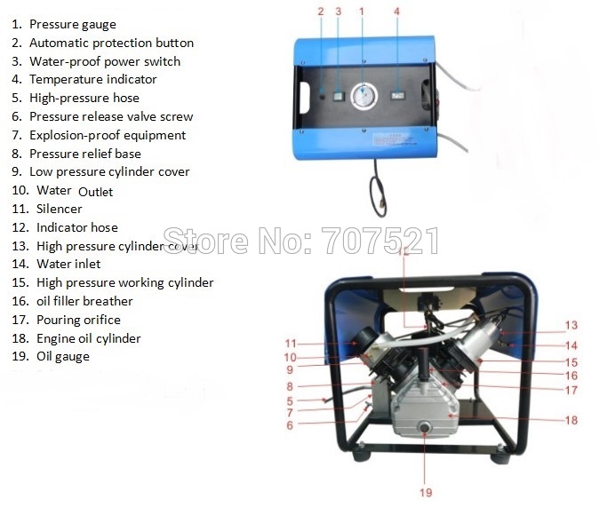 Oil: 50 or 100# reciprocating air compressor oil ( or 5W-40 oil )(the machine is without of oil because the oil is not allowed in the plane)